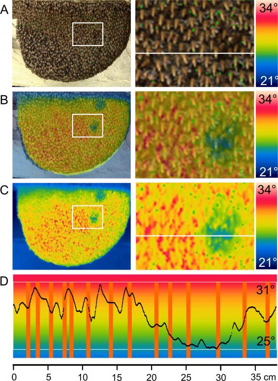 Identifikation von warmen und kalten Zonen an der Oberfläche eines Nestes von A. dorsata. Quelle: Kastberger et al. CC by 4.0