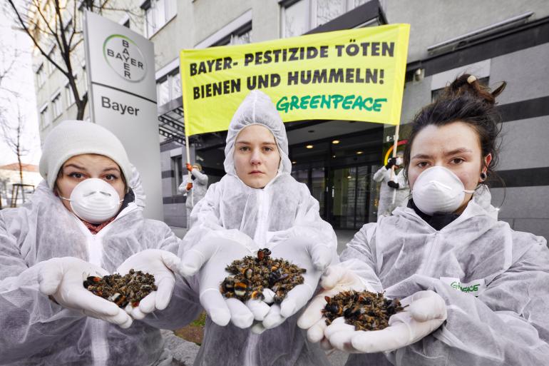 Aktivistinnen und Aktivisten der Umweltschutzorganisation Greenpeace haben in Österreich mit hunderten toter Hummeln und Bienen vor der Österreich-Zentrale von Bayer protestiert. Mit weißen Schutzanzügen bekleidet wollten sie so ein Zeichen gegen den Verkauf von Pestiziden setzen, die für Blütenbesucher giftig sind. Die vom deutschen Konzern hergestellten Wirkstoffe Imidacloprid und Clothianidin stellen nachweislich ein hohes Risiko für Bienen, Hummeln und Wildbienen dar. Greenpeace fordert Bayer daher auf, die tödlichen Wirkstoffe umgehend vom österreichischen Markt zu nehmen.