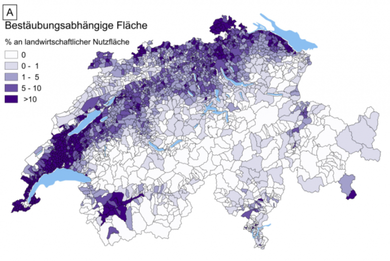 Forscher untersuchten die Bedeutung der Bestäubungsleistung von Honig- und Wildbienen für die Schweiz. Dabei zeigte sich, dass, zusätzlich zu den Obst- und Beerenflächen auf 14 % der Ackerfläche bestäubungsabhängige Kulturen angebaut werden. Nicht überall stehen dafür genügend Honigbienen zur Bestäubung zur Verfügung, obwohl die Abdeckung im landesweiten Durchschnitt relativ gut ist. Angesichts dieser bedeutenden Zahlen für die Landwirtschaft ist Bienen- und Wildbienenschutz gefragt.