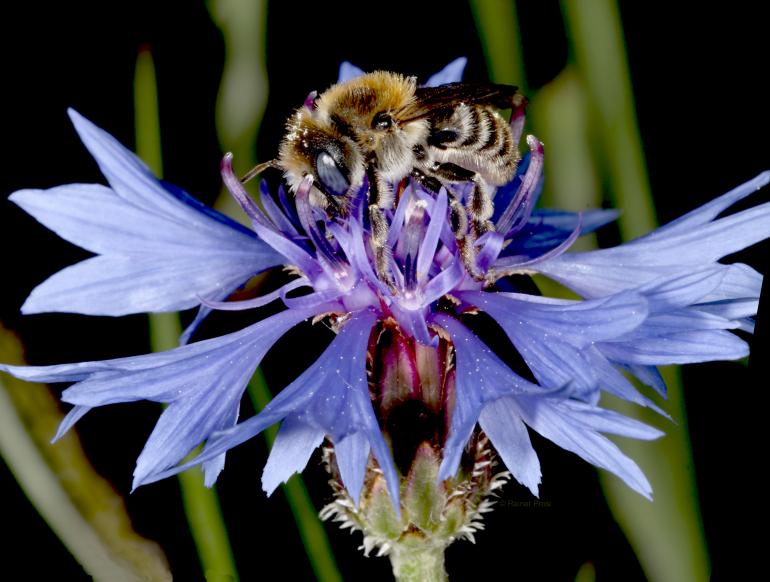 Die Mohnbiene (Hoplitis papaveris) beim Blütenbesuch auf einer Kornblume. Diese Einsiedlerbiene ist bundesweit stark im Bestand gefährdet und eine typische Bienenart der Agrarlandschaft. Quelle: Rainer Prosi, Crailsheim