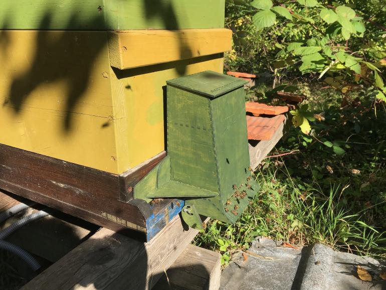 Apic.ai aus Karlsruhe setzt auf die visuelle Überwachung von Bienenstöcken. Und die erfolgt mithilfe einer kleinen Holzkiste vor dem Einflugloch. Wie bei einer Pollenfalle müssen die Bienen durch diese Einlasskontrolle. Dabei werden sie von einer Kamera gefilmt. Die Aufnahmen werden mit Hilfe neuronaler Netze automatisiert analysiert.