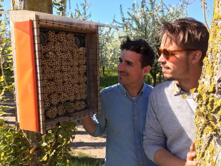 Wolfgang Reuter und Otmar Trenk vom Startup BEEsharing versorgen Obstbauern mit Mauerbienen, die verstärkt zur Bestäubung eingesetzt werden. Foto: obs/ZDF/Jochen Klöck