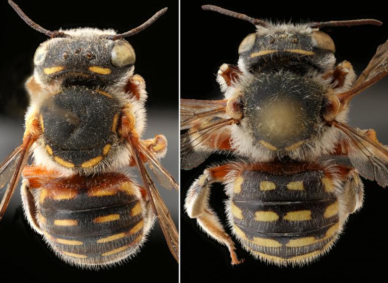 Die neuentdeckte Wollbiene Anthidium atlaskabirense: links ein Weibchen, rechts ein Männchen. Fotos: Max Kasparek