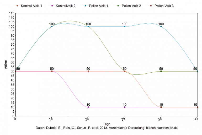 | Tage | Kontroll-Volk 1 | Kontroll-Volk 2 | Pollen-Volk 1 | Pollen-Volk 2 | Pollen-Volk 3 | |||||