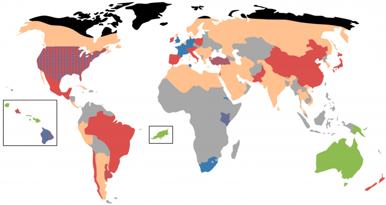 Globale Verbreitung des Flügeldeformationsvirus. Rot = DWV-A, Blau = DWV-B, Orange = DWV-Varianten unbekannt, Grau = keine Daten verfügbar, Grün = kein DWV, Schwarz = keine Westliche Honigbienen. Quelle: Grindrod et al. 2021, CC BY 4.0