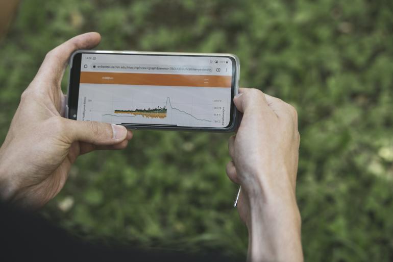 Umweltdaten mit dem Ein- und Ausflug der Bienen zusammenbringen: Die Website von EnBeeMo zeigt das Zusammenspiel von Bienenflug und der Temperatur des Geländes an. Foto: Johanna Weber/Hochschule München