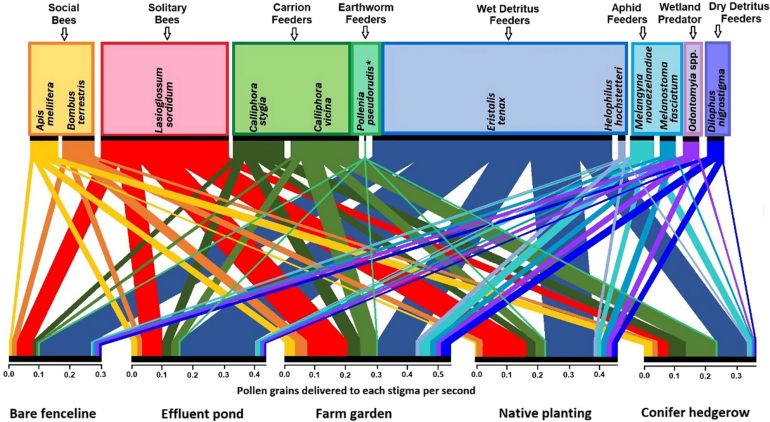 Je nach untersuchtem Merkmal trugen andere Taxa zu den Bestäubungsleistungen maßgeblich bei. Die Schwebfliegen E. tenax etwa vor allem an Abwasserteichen und kahlen Zaunlinien, während Schmeißfliegen Calliphoridae die meiste Bestäubung bei Koniferenhecken erbrachten.