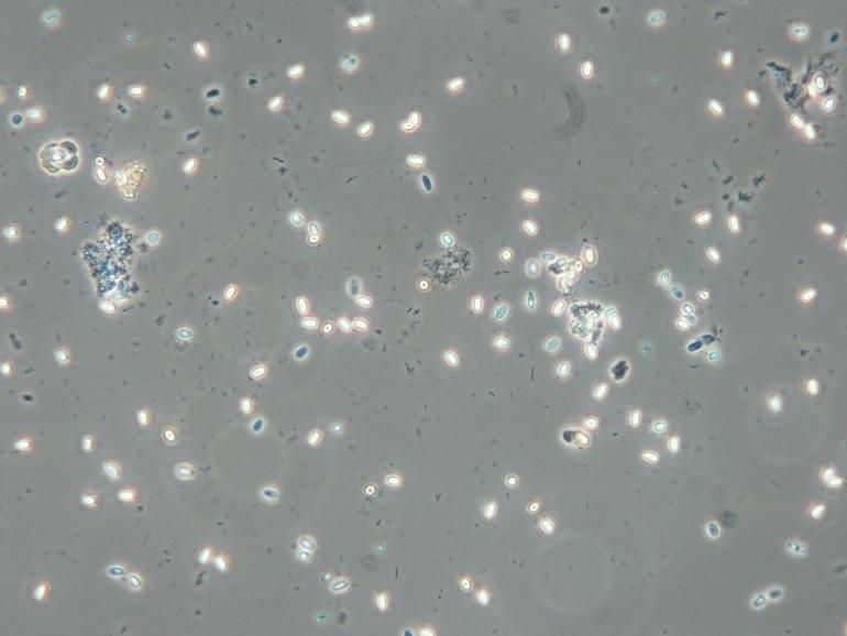 Nosema apis in 400-facher Vergrößerung. Foto: KY State University Bee Lab Frankfort, KY/Flickr, CC BY 2.0 DEED