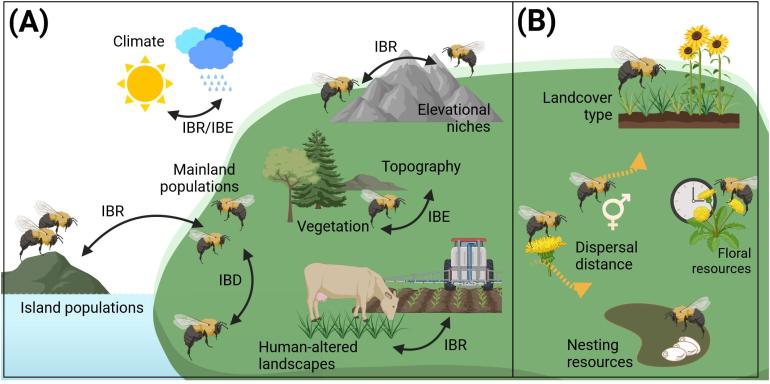 Zusammenfassung der Parameter, die den Genfluss beeinflussen. (A) Durch genetische Analyse identifizierte Effekte. (B) Effekte, die aufgrund der Ökologie einer Art voraussichtlich den Genfluss beeinflussen. IBD: Isolation durch Distanz; IBE: Isolation durch Umwelt; IBR: Isolation durch Resistenz. Quelle: Gornall et al. 2025, CC BY 4.0