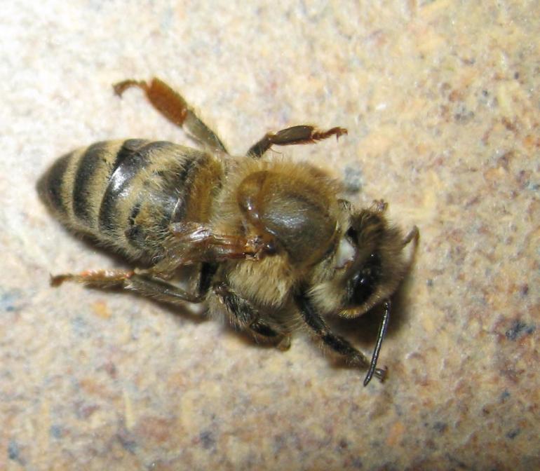 Flügeldeformationsvirus bei einer Honigbiene. Quelle: Xolani90/Wikipedia, CC BY-SA 3.0