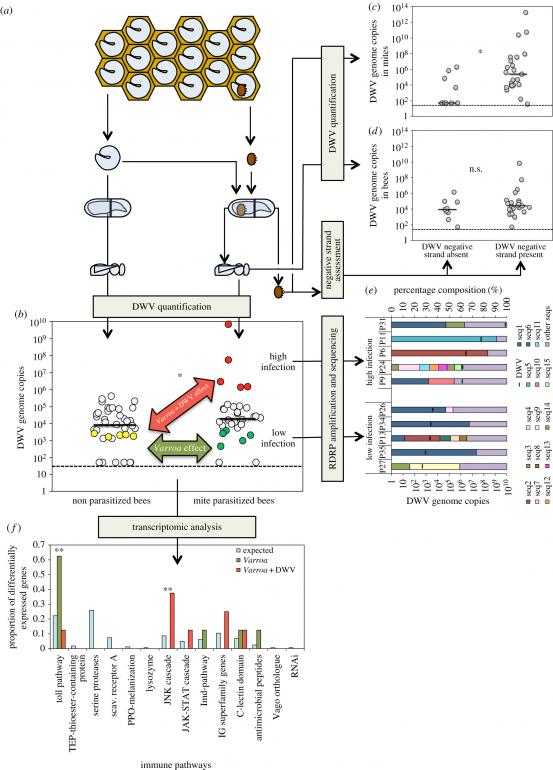 Die Wissenschaftler schließen aus ihren experimentellen und theoretischen Ergebnissen, dass der durch die Nahrungsaufnahme der Milben verursachte Stress das Potenzial besitzt, das Gleichgewicht zwischen dem Erreger und der Immunabwehr der Biene zu destabilisieren. Die Intensität, mit der Milben am Fettkörper der Honigbienen zehren, beeinflusst das Fortschreiten der Virusinfektion durch die gleichzeitige Entfernung antiviraler Immunressourcen.