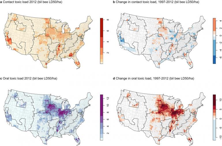 Die Forscher erstellten separate Schätzungen für berührungsbedingte toxische Belastungen, beispielsweise wenn eine Biene direkt besprüht wird, und für orale toxische Belastungen, etwa wenn eine Biene den Pollen oder Nektar einer kürzlich behandelten Pflanze aufnimmt. Sie erstellten eine Karte der vorhergesagten insektizidtoxischen Belastung auf Ebene der Countys.