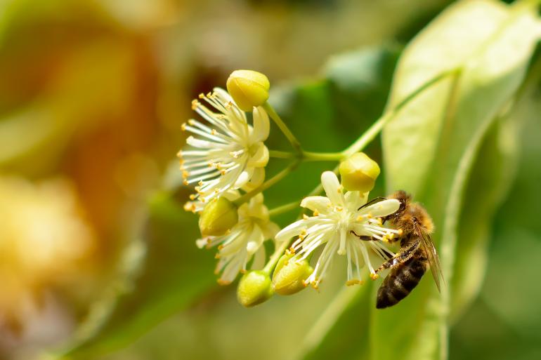 Eine Honigbiene auf einer Lindenblüte. Foto: obs/Bund deutscher Baumschulen (BdB) e. V./Kosolovskyy/iStock