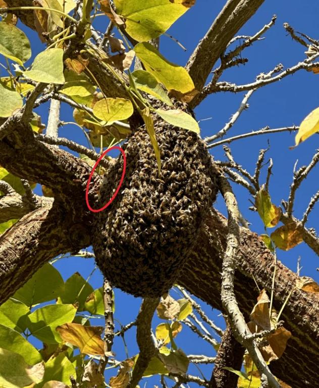 Ein Bienenvolk auf dem Campus der Universität lebt in einem Straßenbaum, nachts mit künstlicher Beleuchtung. Die rote Markierung zeigt Wabenbau; es handelt sich daher nicht um einen Schwarm. Quelle: Kim et al. 2024, CC BY 4.0